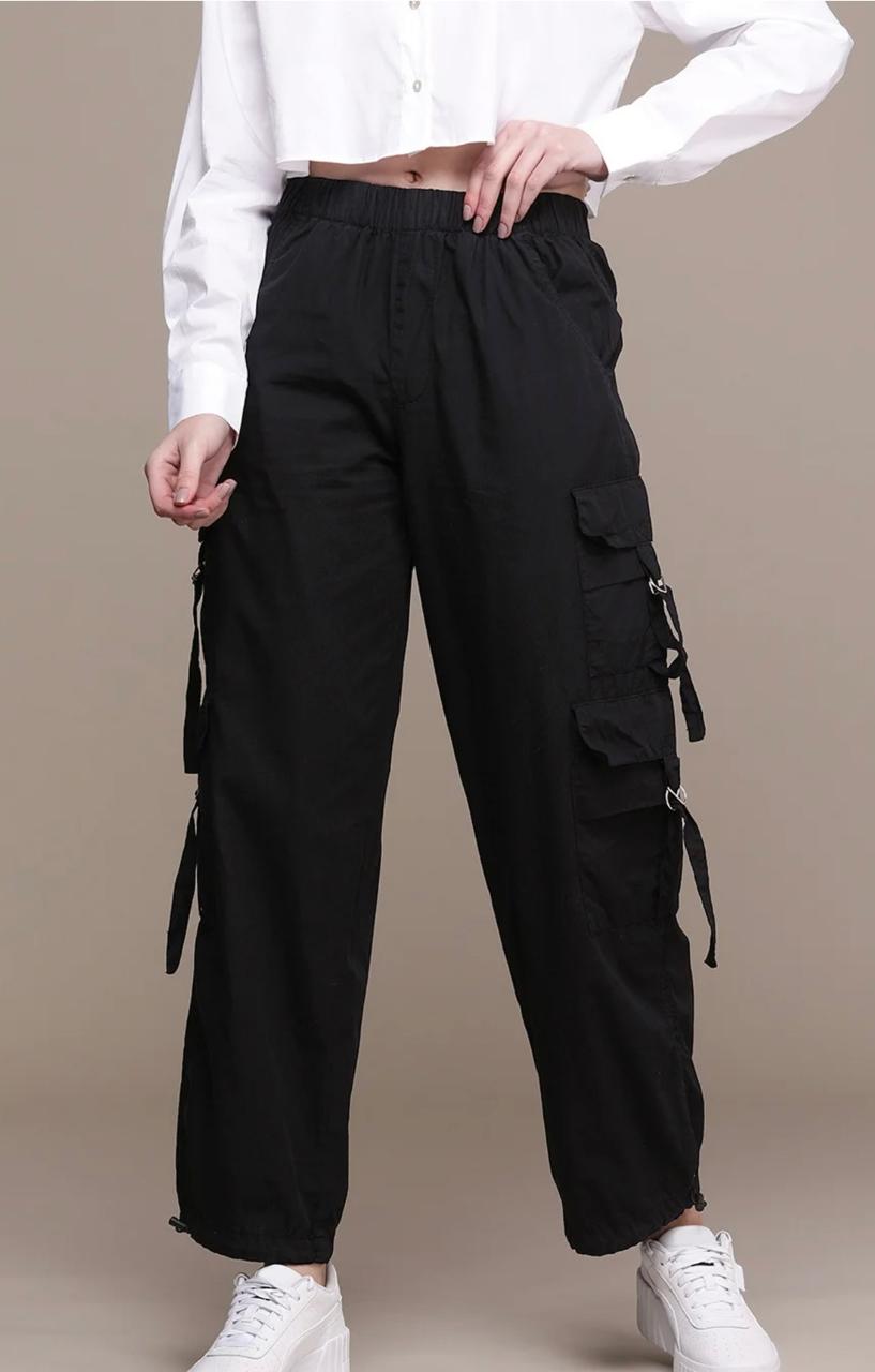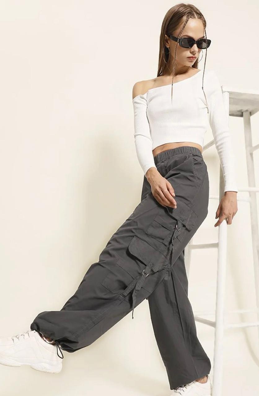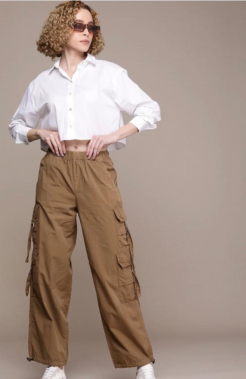 Featuring a high-rise waist and a relaxed parachute fit, these women’s cargo pants offer a flattering silhouette while allowing easy movement. The utility-inspired cargo pockets add both style and functionality, making them ideal for casual outings, travel, college wear, and weekend looks.